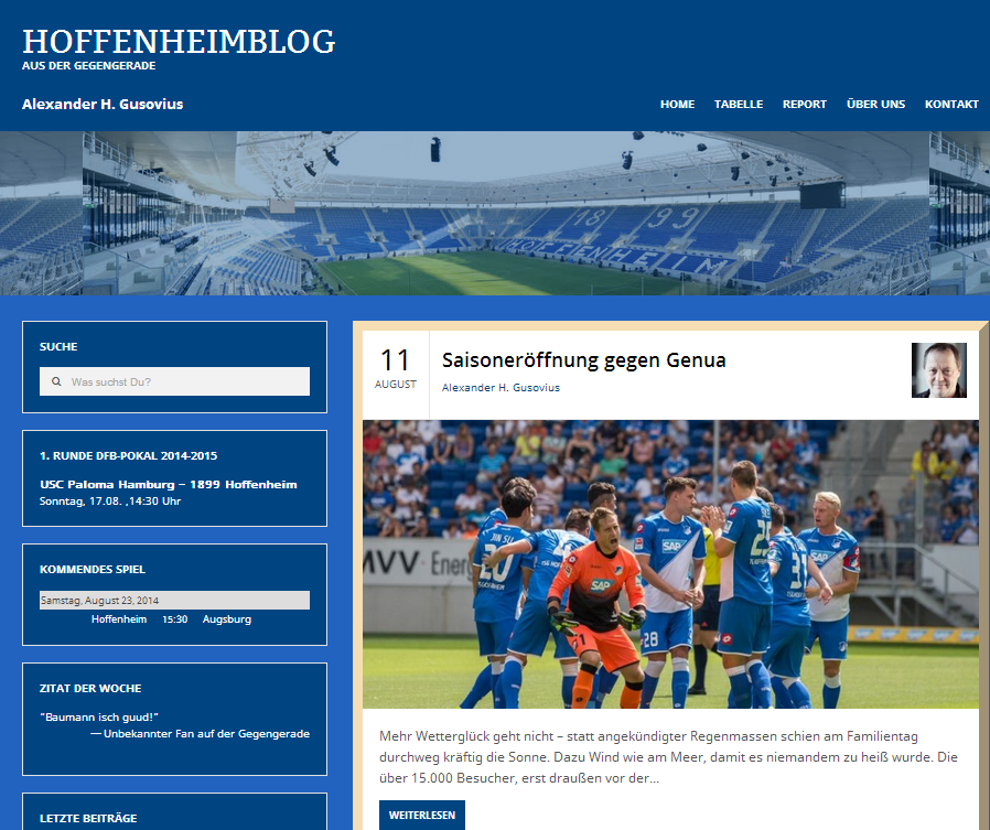 Seit wenigen Stunden ist das Hoffenheimblog.de für alle erreichbar. Eine weitere Quelle für Fans und Freunde der TSG hat sich somit auf den Weg gemacht die Herzen der Fans zu erobern. Ab sofort gibt es vor und nach den Spielen der TSG Hoffenheim fundierte Analysen und Meinungen aus der Sicht...