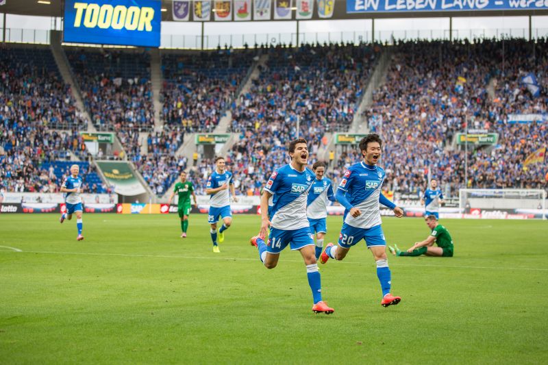 Dem griffigen neuen Markenclaim der TSG „Ein Team – ein Weg – einmalig“ tat das keinen Abbruch. Denn in Sinsheim erlebt man weiterhin besondere Momente. Erst die riesige Fan-Choreographie mit dem sonnenbebrillten, die Faust ballenden, schwebenden Mega-Fan vor der Südkurve, in ein Meer blau-weißer Fähnchen getaucht. Dann die Spielweise der TSG, dazu der Dauersound der Fan-Anfeuerungen… Souverän kontrollierte Hoffenheim die Partie, von den Fans konsequent begleitet. In der Summe führte das zu ungewohnt niedriger Herzfrequenz beim Zuschauen, ohne dass es an aufregenden Szenen fehlte, aber es führte eben auch zu einem wohltuenden Gefühl von Sicherheit.